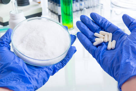 White powder on a marble background representing a pharmaceutical concept illustrating chemical structure and health care