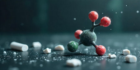 A detailed representation of a molecule featuring red and green atoms sits amidst scattered sugar granules and particles on a dark surface, highlighting the intricacies of molecular structures.