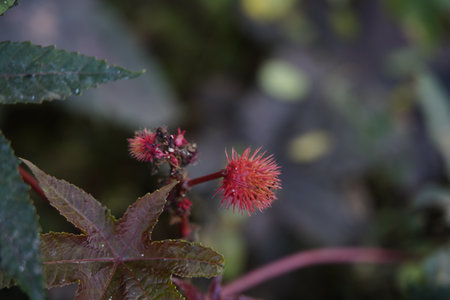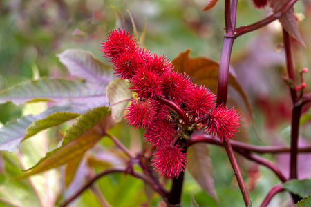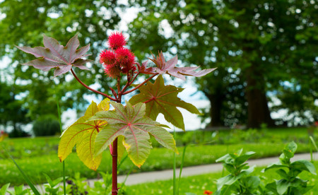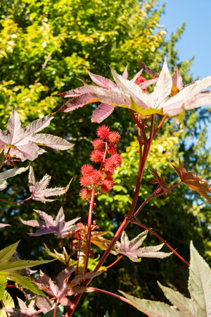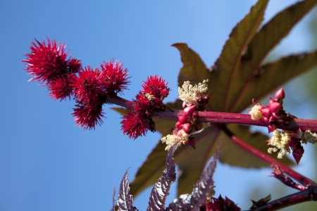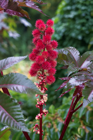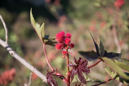 Castor oil, Ricinus communis, is a poisonous and medicinal plant with red flowers and poisonous beans.
