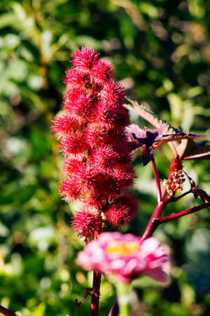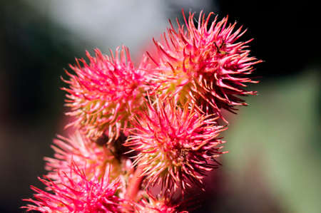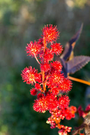 Red and prickly fruits of a Castor oil plant (Ricinus communis) in the sunshine.