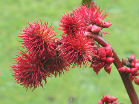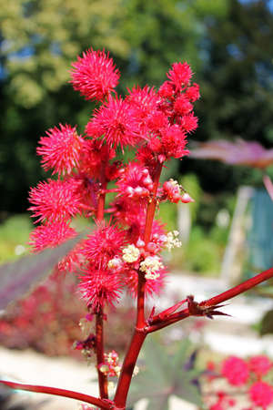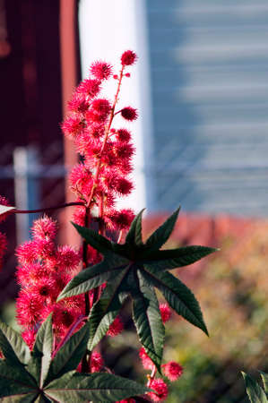 Red flowers of the castor bean plant from which castor oil is produced.