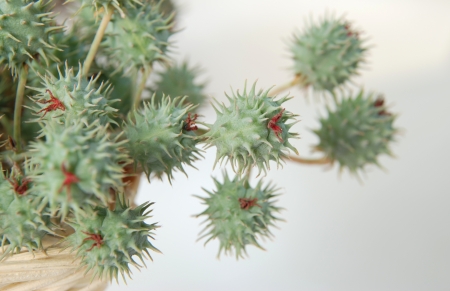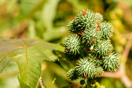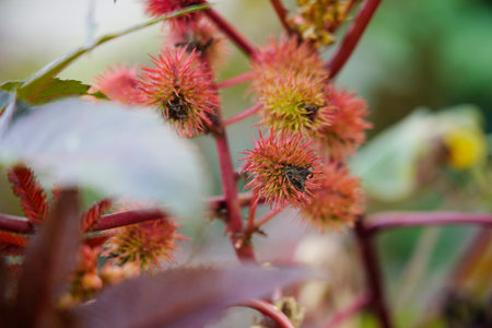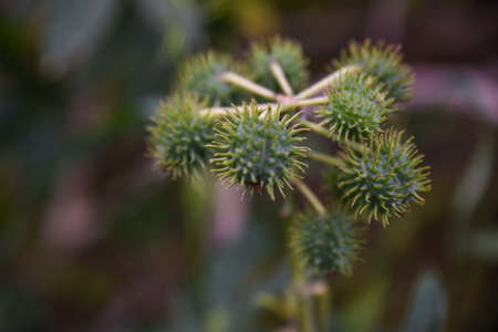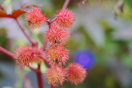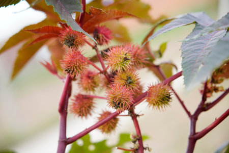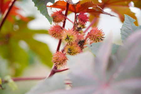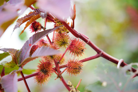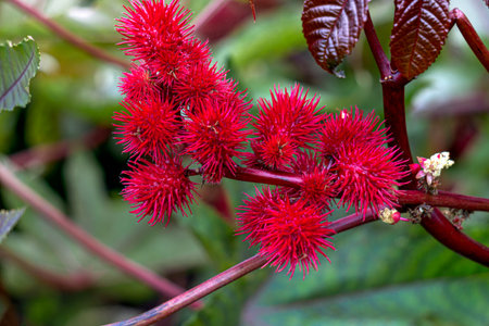 Red prickly fruits of the castor oil plant (Ricinus communis), a species of flowering plant in the spurge family, Euphorbiaceae