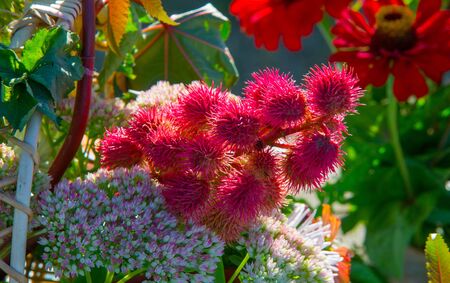 Castor oil plant with red prickly fruits and colorful leaves. Ricinus communis in the vegetable garden