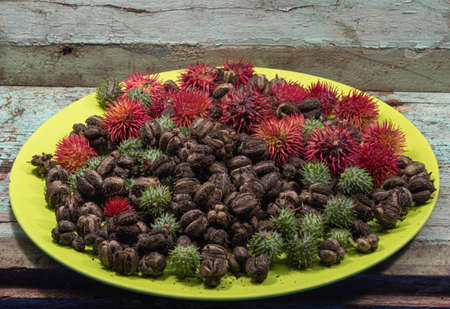 Green dish with castor seeds and fruits (Ricinus communis L). The fruits have thorns and the seeds have different sizes and colors. Toxic seed, due to the presence of ricin protein.