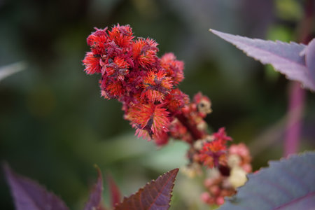 Castor tree leaves, castor leaf, Flowering ricinus communis. Red round original flowers. Carved purple leaves.