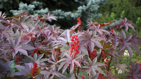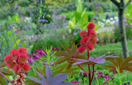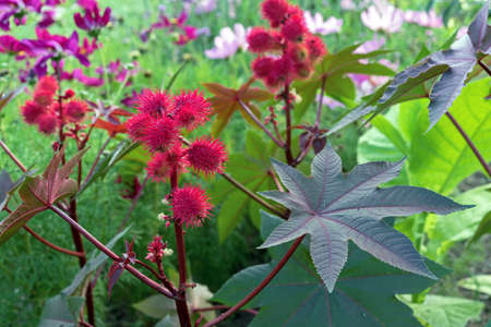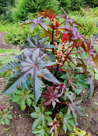 Ricinus communis or castor oil plant growing in garden in summer