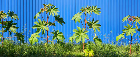 Panoramic image of castor bushes growing along the blue fence.