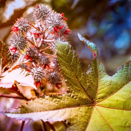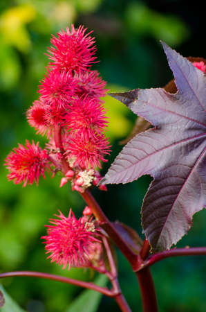 Leaf of spike red flower oil castor (Ricinus Communis) plant, a beautiful bright plant toxic dangerous.