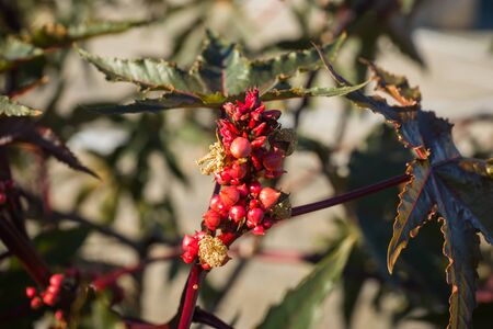 Red fruits of Ricinus communis or Castor Bean Plant. Seeds of Castor Oil Plant.
