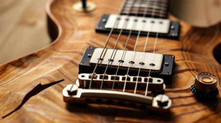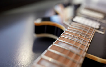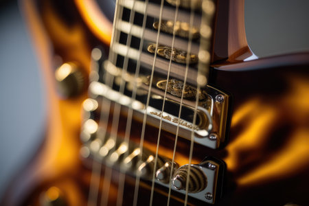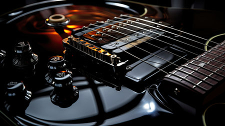close-up of electric guitar, with the strings and frets in focus, created with generative ai