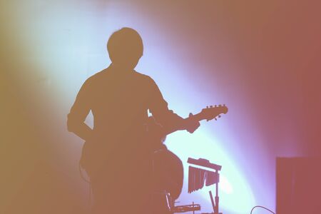 vintage tone of silhouette of guitar player at concert in front of bright stage lights