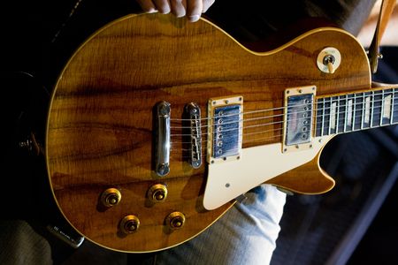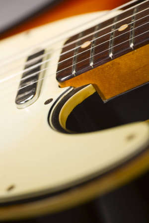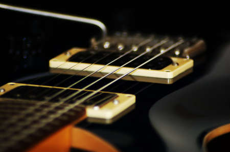 detail of a black and yellow electric guitar useful as a background - focus on the center of the image