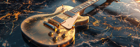 shimmering gold electric guitar rests on sleek marble flooring, reflecting light and luxury.