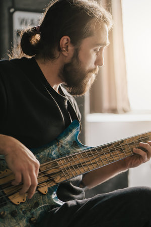 Bearded Man Playing Blue Electric Bass Guitar, vertical image