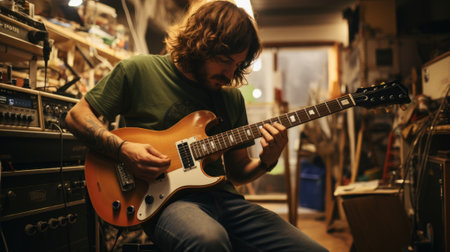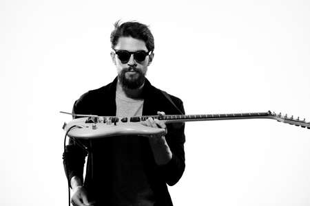 Man with guitar music performance entertainment contemporary performer sunglasses studio