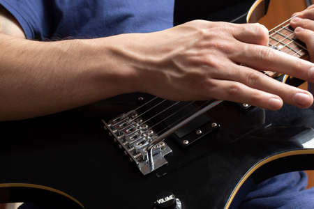 Person plucking the strings on the frets of an electric guitar. Selective focus. Copy space.