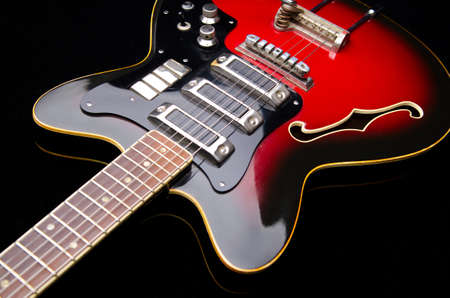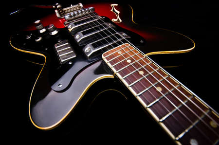 Honey sunburst vintage electric jazz guitar closeup on the black background, with plenty of copy space. Selective focus.