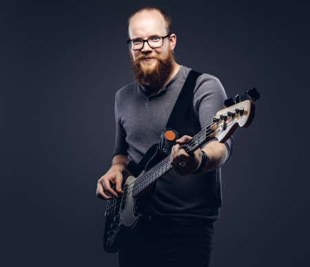 Smiling redhead bearded male musician wearing glasses dressed in a gray t-shirt playing on electric guitar. Isolated on gray background.
