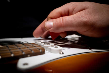 Close up of man playing on electric guitar during gig or at music studio. Musical instruments, passion and hobby concept.