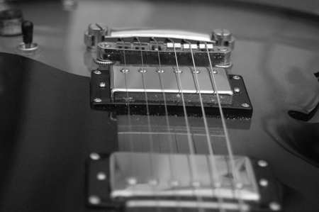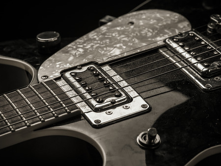 Different parts of a guitar such as strings, neck, frets, case, bridge. Black and white photography