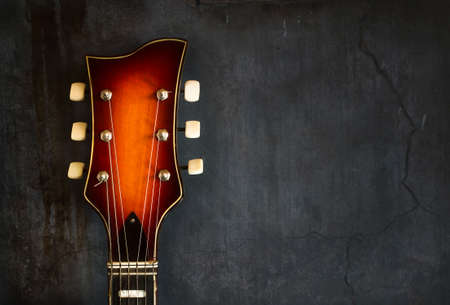 Close-up of headstock old electric jazz guitar on a dark blue background with copy space