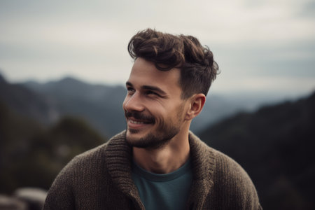 A close-up portrait of a young man with curly hair and a warm smile, set against a calming blue backdrop. His expressive eyes and friendly demeanor radiate positivity and approachability, inviting connection and warmth.