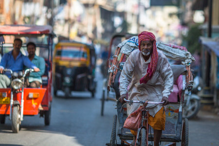 DELHI, INDIA - OCTOBER 22, 2016: Cyclorickshaw rides in the center of Delhi, India.