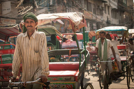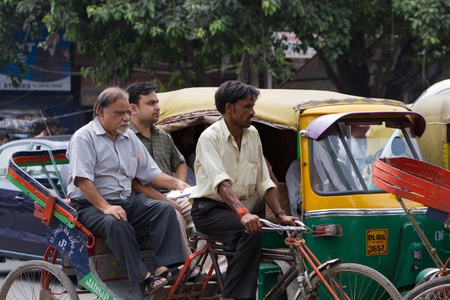 Delhi, India - September 18, 2014: Cycle rickshaw riding the vehicle under the heat on the street of Old Delhi, India on September 18, 2014.