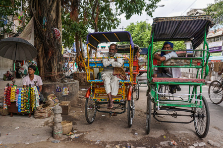 Delhi, India - Jul 27, 2015. Rickshaw waiting on street in Delhi, India. Delhi city proper population was over 11 million, the second-highest in India.