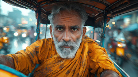 A man in a yellow robe is driving a rickshaw. He has a beard and is wearing a beard oil