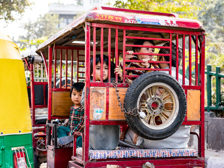 New Delhi, India, Feb 20, 2018 - Children look out the back of a tuk-tuk through grating