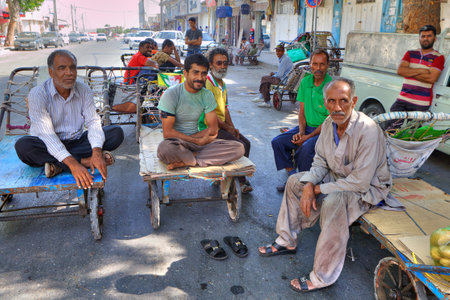 Bandar Abbas, Hormozgan Province, Iran - 16 april, 2017: Several market workers sit on platforms handcarts during a break at work.