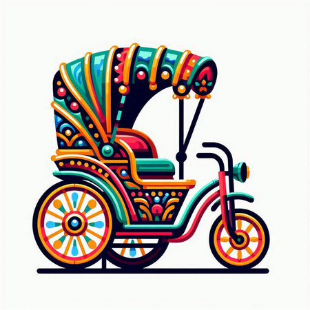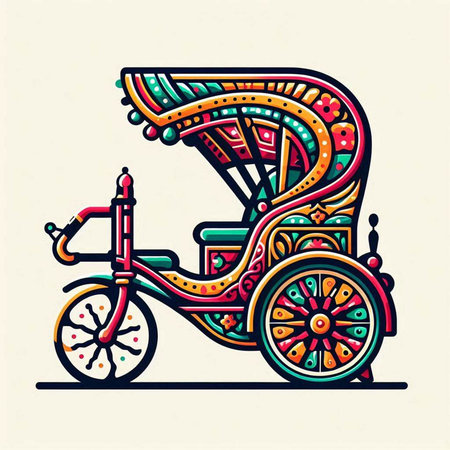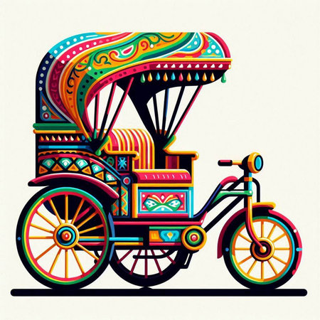 Hand drawn vector illustration of a trishaw with colorful ornament.