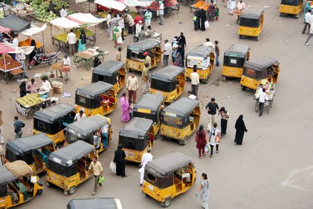 Capture the lively essence of a city market with bright yellow auto rickshaws navigating through streets filled with shops, under sunny skies.