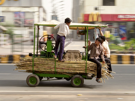 Agra , India - May 11, 2013 : 4 unidentified men were moving sugar cane and sugar cane juicer machine to set the stall near Taj mahal. Agra , India