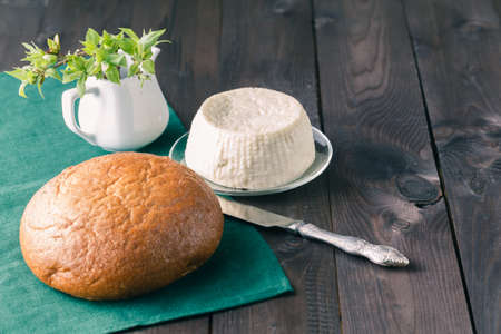 Fresh homemade cheese with wine and bread. Still life with a round of cheese. A circle of curd cheese on a plate.