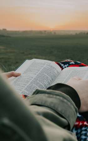 Raised hand holding the Holy Bible illuminated by morning sunlight. copy space. Horizontal shot.