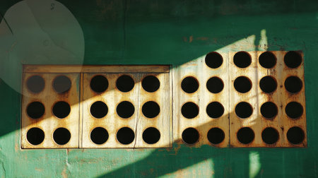 A close-up view of a rusty industrial wall featuring circular holes, bathed in sunlight. The green background enhances texture and visual interest.