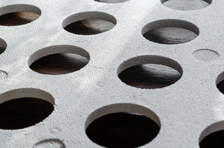 This closeup of black polystyrene foam showcases its intricate circular textures and patterns, making it ideal for design applications that inspire creativity in various artistic endeavors