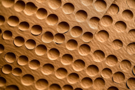 Abstract geometric composition with shadows. A sheet of white with round holes rests on top of a brown surface. Selective focus.