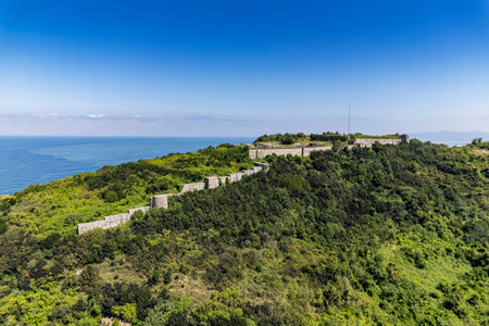 Landscape view old walls of fortress on Mediterranean coast. View of Alanya Castle, stone ruins in Alanya, Turkey. High quality photo