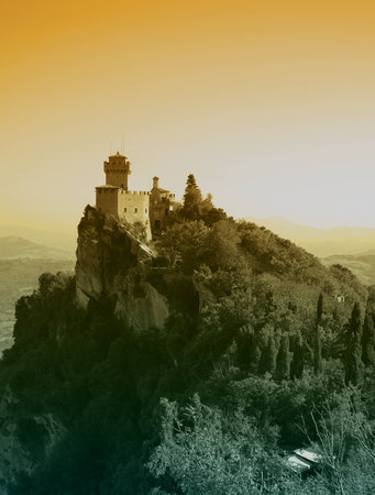 A majestic cliffside with a stone fortress perched on top, overlooking the lush green landscape below.