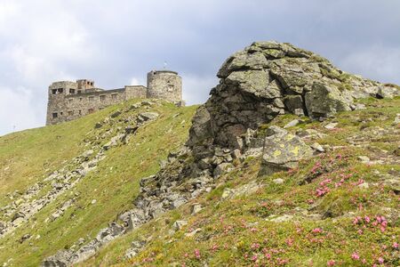 Old observatory castle on the mount Pip Ivan, Pop Iwan, Czarnohora and pink rose rhododendron flowers on rock mountain slope. Hiking travel outdoor concept, the Carpathian Mountains, Chornohora, Ukraine.