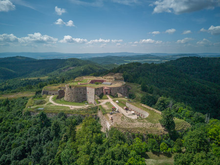 Aerial view of Prusy Fort in Nysa city on clear day, Star-shaped historical military fortress surrounded by lush greenery and the town in background. Tourist attraction in Poland