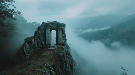 Mystical ancient stone portal on misty mountaintop for fantasy and adventure themes.