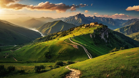 This image features a majestic medieval castle atop a scenic hillside, flanked by robust stone walls and surrounded by lush greenery, beneath a bright blue sky interspersed with clouds. AI generated image