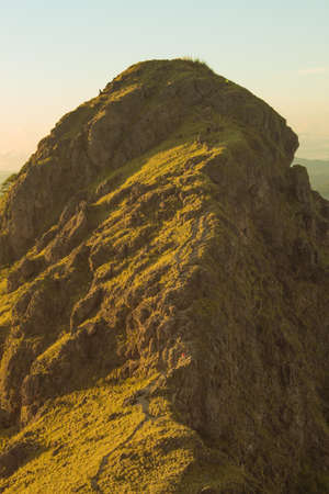 A dramatic view of a sharp mountain crest under a cloudy sky. The slopes are covered in lush green vegetation with rocky outcrops creating a textured, natural landscape.