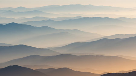 Atmospheric showing misty mountain range layers at sunrise with hazy blue and orange tones keywords:...