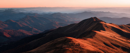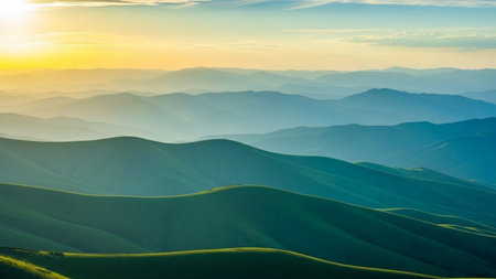 A breathtaking view of rolling hills bathed in warm hues during sunrise. The misty mountains create a serene and tranquil atmosphere perfect for nature lovers.