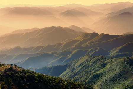 Panorama landscapes of foggy mountains in morning time on mysterious background. Nature in the evening before the sunset behind the mountain. Doi Phu kha National park of thailand.